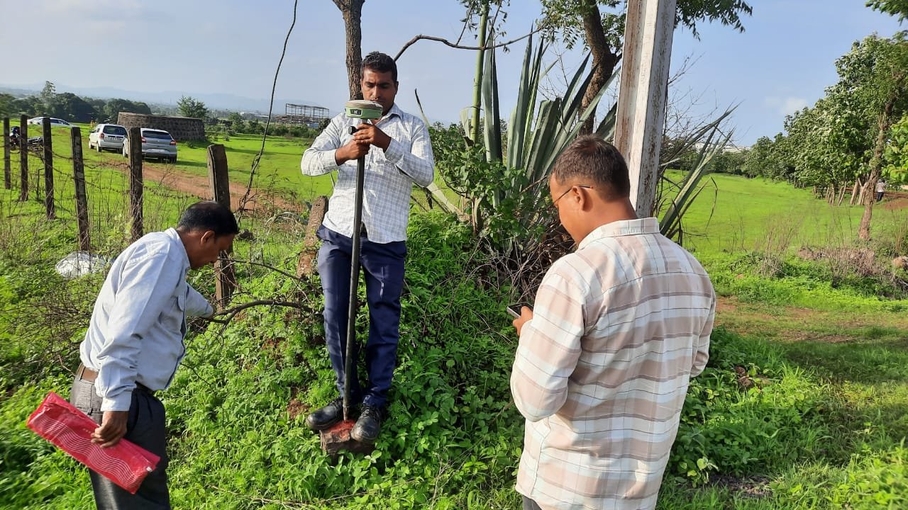 Land survey work is being actively conducted on-site, with officials and equipment deployed for accurate boundary marking.